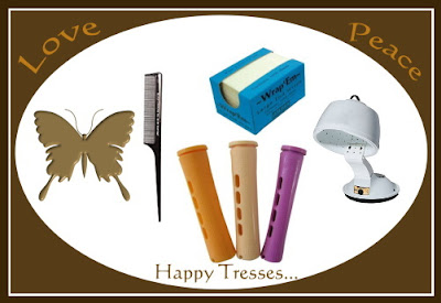 I used the items pictured above to create my roller-sets. I used a rat tail comb to part my columns and rows. The tail was used to create the parts and the fine teeth were used to help smooth out the strands prior to my adding the end papers at the bottom of the sectioned hair. I then applied a cream to my strands. I used end papers to keep my ends together and smooth to cut down on my ends frizzing while my hair dried. At 1 1/2 inches I would use the gray rods (not pictured), then as my hair grew longer, I would use the next larger size rod. When rolling each section, I was sure to hold/pull my hair taught while rolling it on the rod in an effort to help "straightened" the hair. After completing the setting of all sectioned hair, I would sit under the hooded dryer for about an hour then let my hair air dry over night. I was pregnant at the time, thus my hair grew like weeds, so I wore my hair this way up until my 7th month then I created a new style to sport (later post with pics).